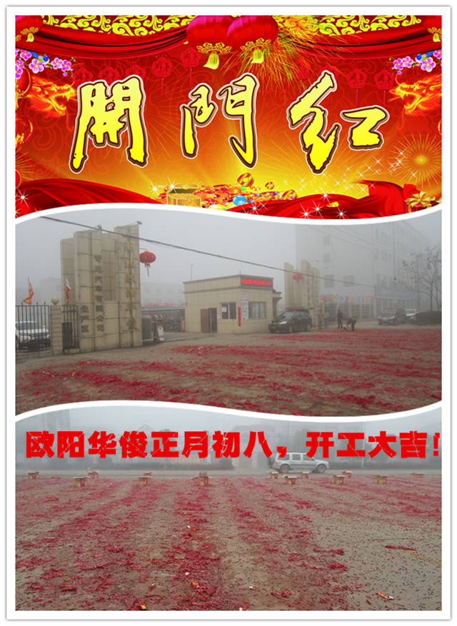今天是個好日子,一大早鞭炮聲是此起彼伏,為了討個好彩頭,“開門炮”來預兆新的一年開門紅,生意興隆,紅紅火火。感謝各位新老顧客朋友對我公司的支持及宣傳,歐陽華俊愿與您一起共創美好未來!在此恭祝大家在新的一年幸福安康!事事順利!家和萬事興!