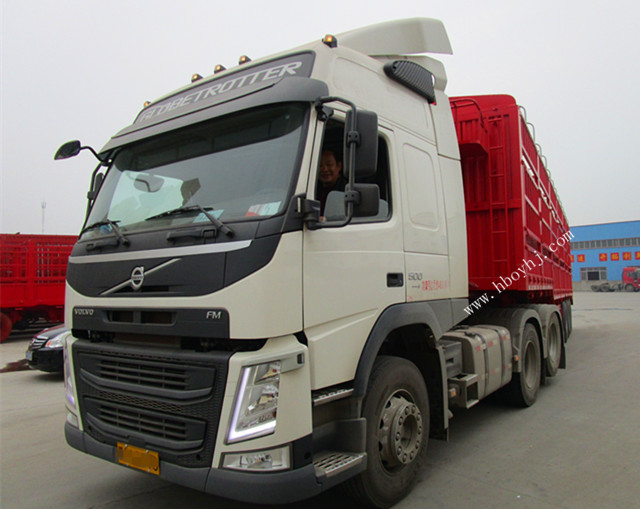 下面展示一下歐陽華俊13米高低板倉欄車廂配沃爾沃新FM重卡500馬力的牽引車頭的圖片:
