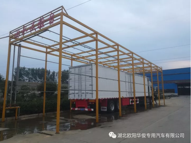 湖北歐陽華俊專用汽車有限公司早在2014年年底公司投資建立了“淋水試驗臺”,目的是檢驗本公司生產的所有廂式運輸車的車身密封性,更進一步提高廂式運輸車的產品質量,踐行“車行天下,質求完美”的理念,歐陽華俊淋水試驗臺成為廂式半掛車檢驗工序中的福音。