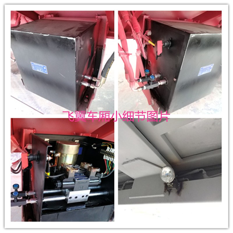 此3臺飛翼半掛車廂的尺寸為:13.58米長×2.55米寬×4米離地高。2軸直梁的車廂,車廂兩側為整體舉升,全飛式中開啟,后門廂式對開門。車廂的液壓系統采用雙作用油缸、電子閥組配原裝進口直流電機驅動,內嵌式防水按鈕開關。此次防水頂布為整頂篷布,達到更好的防水效果。