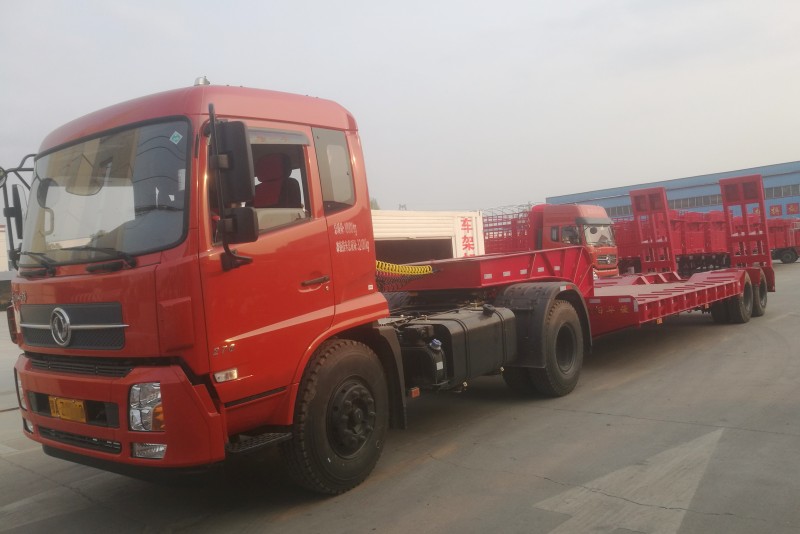 2橋的低平板半掛車后輪中間采用“U”形槽8個(gè)厚鋼板鋪好放鉤機(jī)斗,要求低于工作平臺(tái)??蛻羰褂玫?/span>1100鋼絲胎,拉鉤機(jī)板和裝載機(jī)完全沒(méi)問(wèn)題。