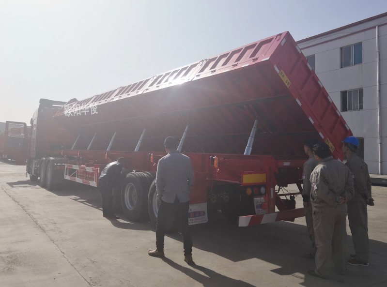 柯老板訂的側翻自卸半掛車大概配置如下:外觀尺寸為13米長×2.55米寬×0.6米高,按客戶要求做的是向右翻,左側為正常欄板樣式,立柱的前站板焊死,后面做活。帶爬梯和篷布架。車廂底板3.0厚平面,整車根據車輛承載質量要求,對車架進行科學設計,合理分載,同等載貨下,有效降低產品自重,可有效提高裝卸及運輸效率。