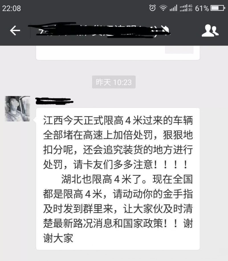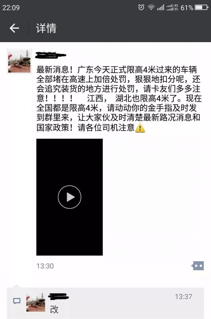 目前,很多微信群及朋友圈都在傳這么一件事:“XX今天正式限高4米過來的車輛全部堵在高速上加倍處罰,狠狠地扣分呢,還會追究裝貨的地方進行處罰,請卡友們多多注意!!!!XX也限高4米了。現在全國都是限高4米,請動動你的金手指及時發到群里來,讓大家伙及時清楚很新路況消息和國家政策!!”