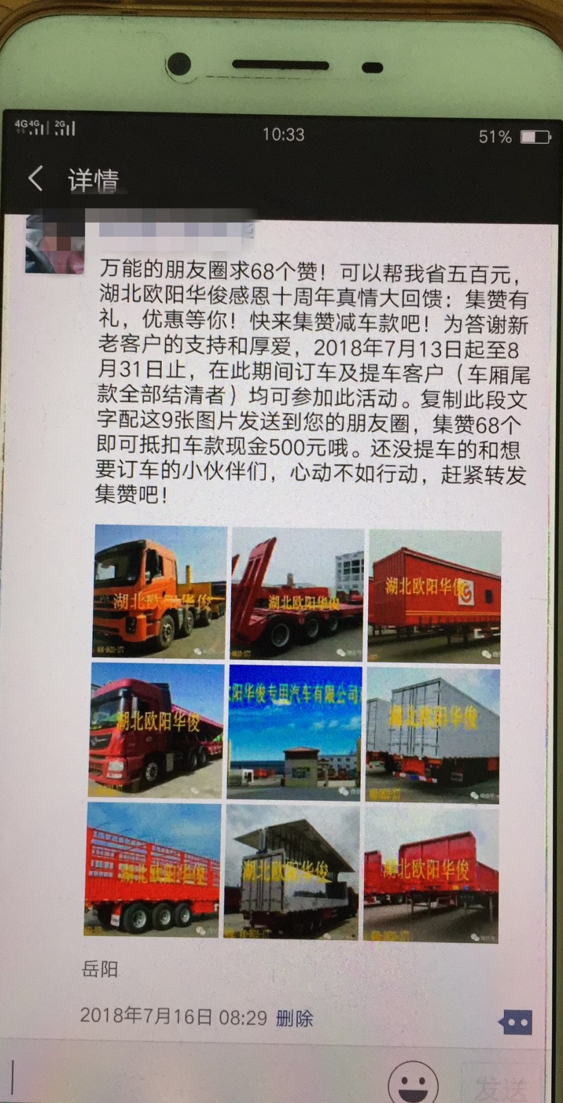 湖北歐陽華俊感恩十周年真情大回饋:集贊有禮,優(yōu)惠等你!快來集贊減車款吧!為答謝新老客戶的支持和厚愛,2018年7月13日起至8月31日止,在此期間訂車及提車客戶(車廂尾款全部結(jié)清者)均可參加此活動(dòng)。復(fù)制此段文字配這9張圖片發(fā)送到您的朋友圈,集贊68個(gè)即可抵扣車款現(xiàn)金500元哦。還沒提車的和想要訂車的小伙伴們,心動(dòng)不如行動(dòng),趕緊轉(zhuǎn)發(fā)集贊吧!