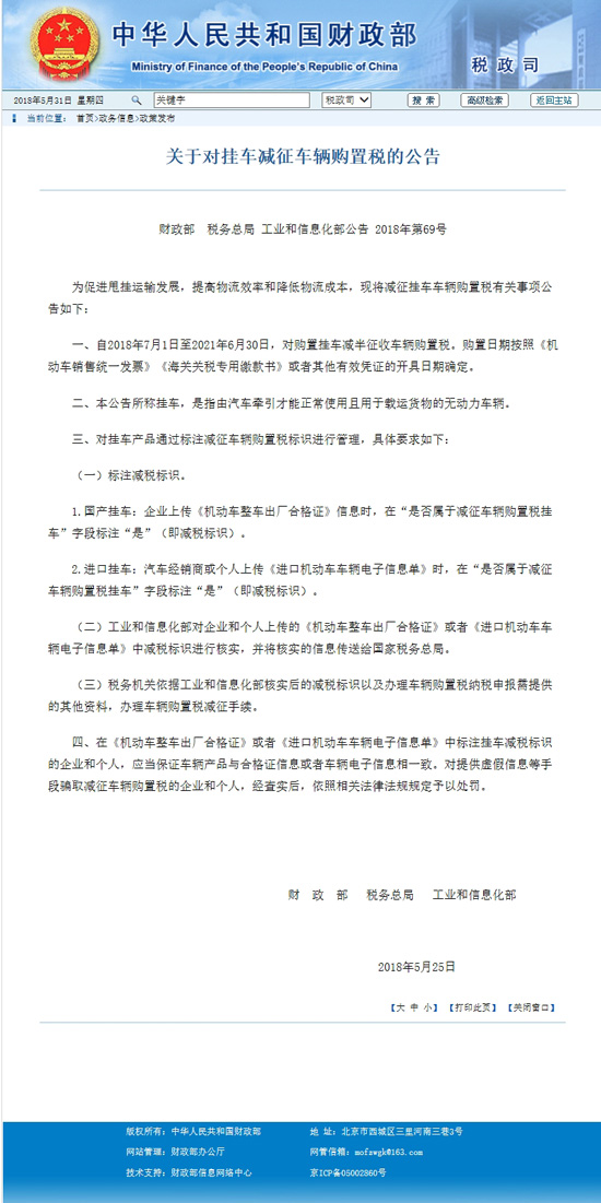 工業和信息化部聯合發布通知,自2018年7月1日至2021年6月30日,對購置掛車減半征收車輛購置稅。