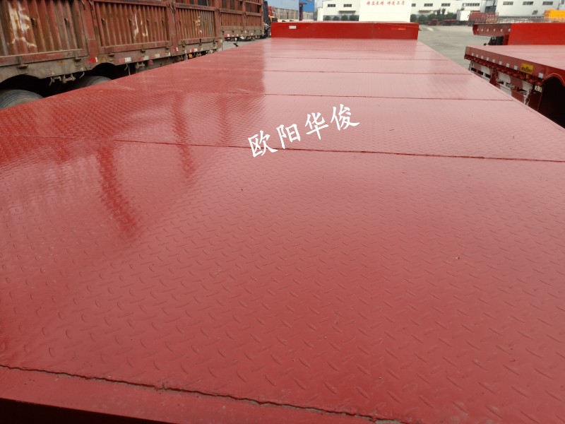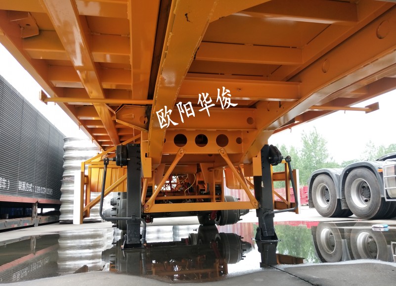 基本配置如下:大梁上10,下10,中腹板6,顏色:華俊大紅,28T單動(dòng)支腿,廣東富華13T車(chē)橋,16T剎車(chē),板簧:10×13,底板:2.5mm花紋板,輪胎設(shè)計(jì)為:12R 22.5型號(hào)輪胎,貫穿梁8#槽鋼,鋪9根底槽,可走叉車(chē)及拉重載。