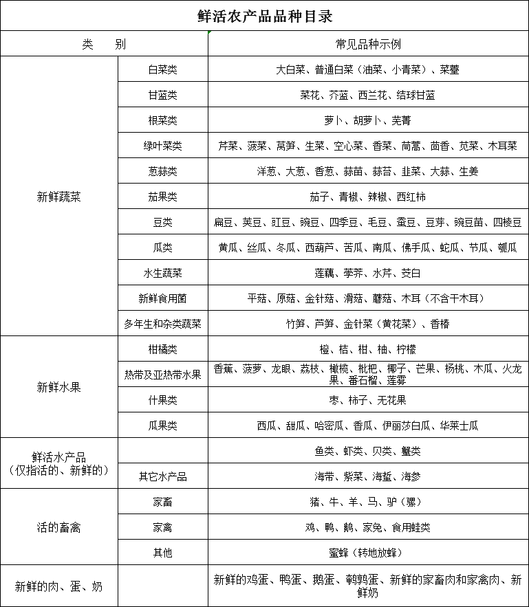 鮮活農產品品種目錄: