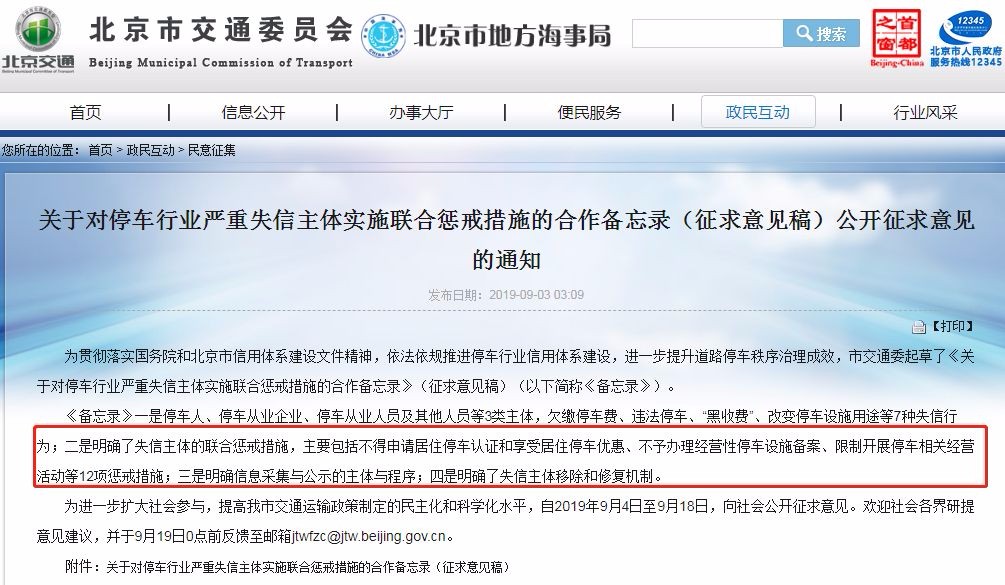 發(fā)布日期:2019-09-10 04:40:51 編輯:歐陽華俊 瀏覽量:20749月3日,北京市交通委就《關(guān)于對停車行業(yè)嚴(yán)重失信主體實(shí)施聯(lián)合懲戒措施的合作備忘錄》(征求意見稿)(以下簡稱《備忘錄》)向社會公開征求意見。