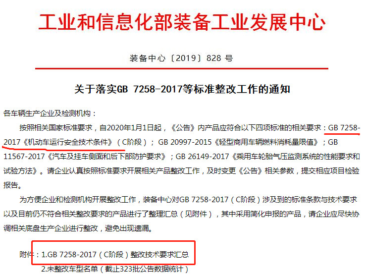 發布日期:2019-11-19 02:17:35 編輯:歐陽華俊 瀏覽量:34172019年10月28日,工業和信息化部裝備工業發展中心下發《關于落實GB 7258-2017等標準整改工作的通知》。