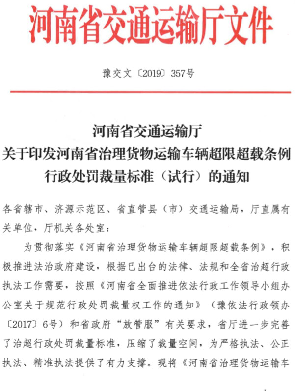 發布日期:2019-12-30 10:07:15 編輯:歐陽華俊 瀏覽量:4901河南省交通運輸廳近日印發了《河南省交通運輸廳關于印發河南省治理貨物運輸車輛超限 超載條例行政處罰裁量標準(試行)的通知》(以下簡稱《通知》)