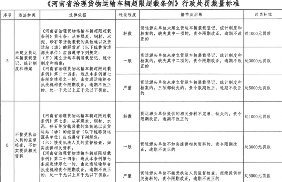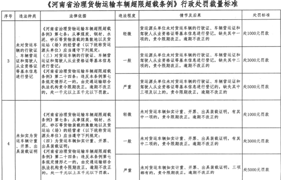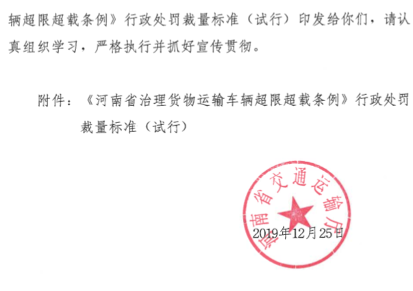 《通知》明確:根據相關條例及要求,進一步完善了治超行政處罰裁量標準,壓縮了裁量空間,現將《河南省治理貨物運輸車輛超限超載條例》行政處罰裁量標準(試行)印發給各地區,要求各地區相關部門認真學習,嚴格執行并抓好宣傳貫徹。