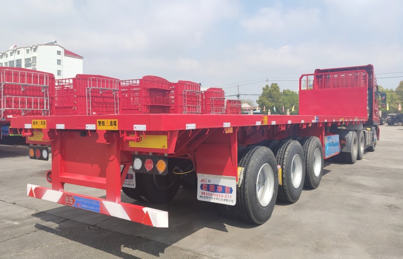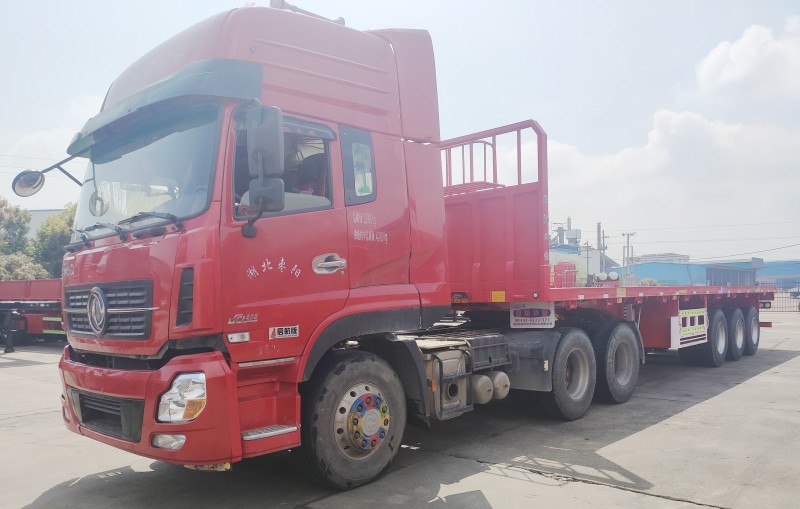 此款超輕型11.5米直梁平板,整車自重14.38噸,掛車自重為5.3噸左右。