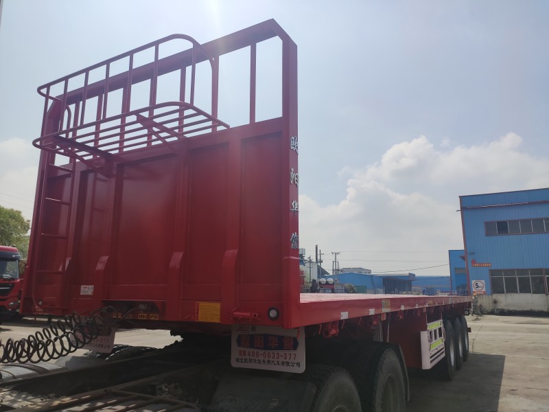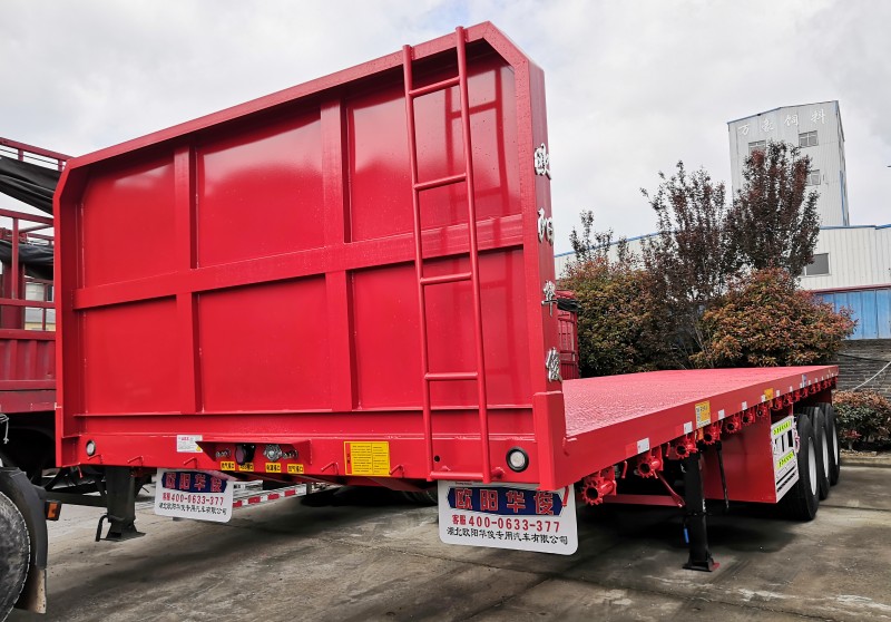 陳總的平板半掛車尺寸為:11.5米長×2.55米寬。前站板做1.8米高,配有篷布架、爬梯。特殊的前站板設(shè)計(jì),上做60公分高小站管,下插4根小槽鋼且內(nèi)封鐵皮,加固整個(gè)前站板的受力。