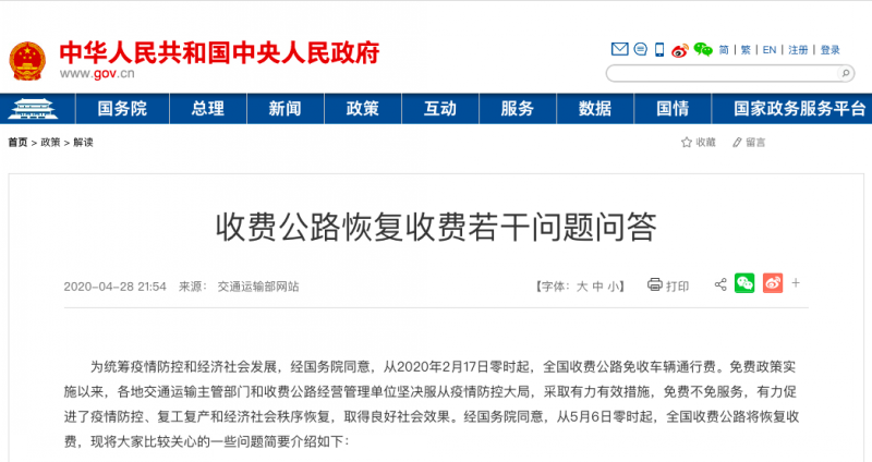 經國務院同意,從2020年5月6日零時起,經依法批準的收費公路恢復收取車輛通行費。其中,開放式收費高速公路和普通公路以車輛通過收費站收費車道的時間為準,封閉高速公路以車輛通過出口車道的時間為準。符合《收費公路管理條例》及相關規定的軍隊車輛(含武警部隊車輛),公安機關在轄區內收費公路上處理交通事故、執行正常巡邏任務和處置突發事件的統一標志的制式警車,經國務院交通主管部門或者省、自治區、直轄市人民政府批準執行搶險救災任務的車輛,鮮活農產品運輸車輛,進行跨區作業的聯合收割機、運輸聯合收割機(包括插秧機)的車輛,以及懸掛應急救援專用號牌的國家綜合性消防救援車輛,繼續依法享受免交車輛通行費政策。
