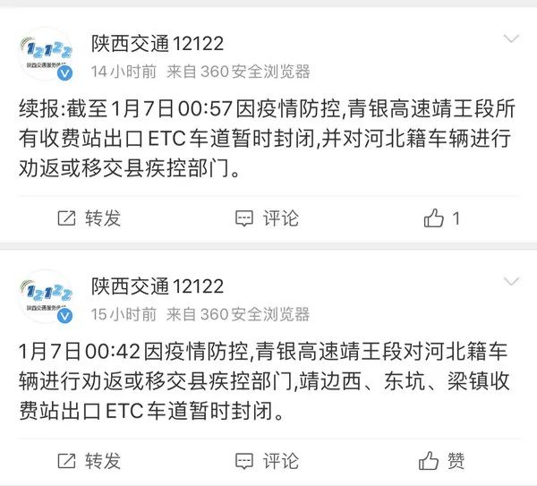 因進行防疫檢測,吳定高速定邊南、楊井、新安邊收費站出口對河北籍車輛進行留觀或勸返。連霍高速西渭段羅敷收費站出口禁止河北、遼寧、黑龍江籍車輛通行。