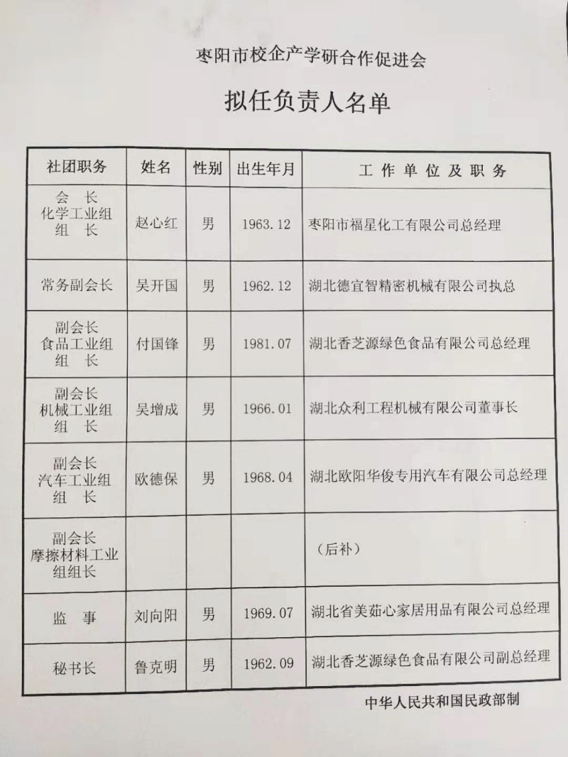 棗陽市校企產學研合作促進會擬任負責人名單,會長化學工業組組長棗陽市福星化工有限公司總經理趙總、常務副會長湖北德宜智精密機械有限公司執總吳總、副會長食品工業組組長湖北香芝源綠色食品有限公司總經理付總、副會長機械工業組組長湖北眾利工程機械有限公司董事長吳總、副會長汽車工業組組長湖北歐陽華俊專用汽車有限公司總經理歐總、兼事湖北省美茹心家居用品有限公司總經理劉總、秘書長湖北香芝源綠色食品有限公司副總經理魯總。
