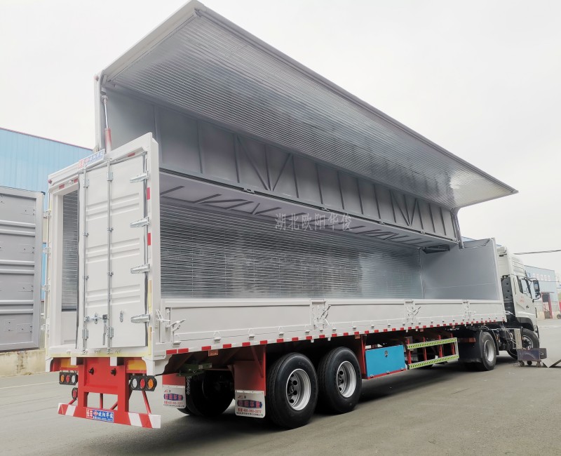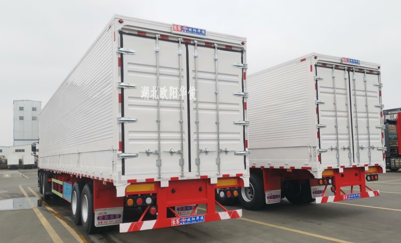 對翼開啟廂式半掛車,歐陽華俊還可定制生產12米、12.5米、13米、13.58米、13.75米等不同長度規格(2軸或3軸),2.55米寬,總離地高不超4米,均有公告營運資質,可上新戶。歡迎廣大新老客戶來廠考察洽談~