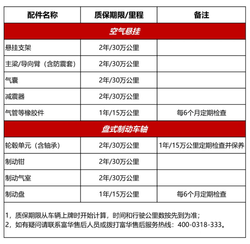 眾所周知,半掛車的上裝部分是由它所承載的貨物決定的,上裝設計是否合理先進決定了車輛的裝載效率,行走機構決定了車輛的安全性和行駛效率。為此,湖北歐陽華俊專用汽車有限公司與廣東富華重工強強聯合,正式推出“暢行無憂”計劃:所有湖北歐陽華俊專用汽車有限公司使用富華空氣懸掛與盤式制動車軸的產品,不論任何車型,均可享受2年/30萬公里質保。