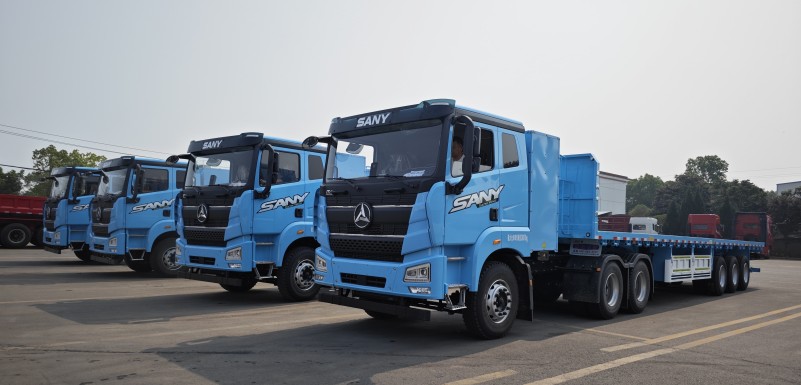 三一重卡電動(dòng)牽引車頭搭載歐陽(yáng)華俊13米拉玻璃專用平板半掛車,組成高效新能源物流組合。首批4臺(tái)已完成整備,鳴笛啟程,"奔向財(cái)富大道"。