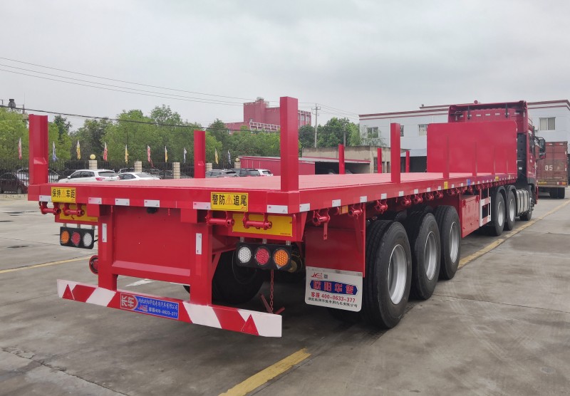 歐陽華俊13米低平板半掛車完工交付,此平板半掛車的尺寸為13米長×2.55米寬×1.5米離地高,全封閉式前站板,后部結構為直梁平板式上面帶60公分插樁。 歐陽華俊高強鋼平板半掛車,車輛使用壽命更長,是您中、短距離運輸鋼材、板材等貨物多拉快跑的選擇車型。