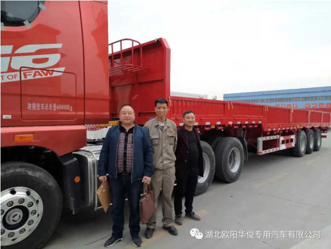 繼今年9月份歐陽華俊推出超輕型倉欄后訂單火爆,很多客戶強烈咨詢超輕型欄板何時能一見真容,眾人翹首以盼,今天超輕型欄板正式閃亮登場啦--5.6噸的欄板半掛車,看荊州趙總一行人與我們銷售經(jīng)理合影的表情,滿意寫在臉上! 歐陽華俊超輕型欄板半掛