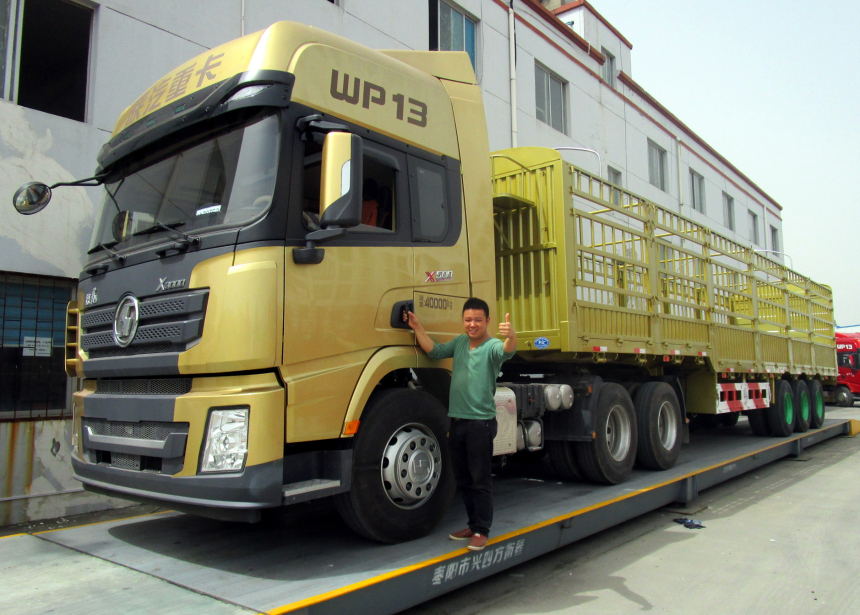 全新的13米土豪金色倉欄半掛車完工交付啦!與湖北恩施的田老板駕駛的陜汽德龍X3000黃金版牽引車那是極好的般配喲O(∩_∩)O 看著田老板得意的笑和豎起的大拇指,作為歐陽華俊人,小編內心像是吃了蜂蜜般的甜! 13米倉欄式半掛車是目