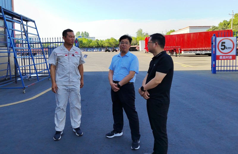 6月15日下午,棗陽市委常委 市委辦公室主任曾剛領(lǐng)導、興隆鎮(zhèn)張鎮(zhèn)長蒞臨湖北歐陽華俊參觀指導工作,湖北歐陽華俊專用汽車有限公司總經(jīng)理歐德保先生熱情接待了來訪領(lǐng)導并對我司的生產(chǎn)流程進行了詳細介紹。 在生產(chǎn)車間門外,歐總為曾主任和張鎮(zhèn)長詳細介紹了生產(chǎn)車間的半掛車制作流程,并和領(lǐng)導們一起進